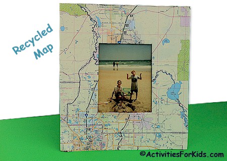 What a fun way to frame vacation pictures! Recycled Map Frame for vacation memories. Perfect for: